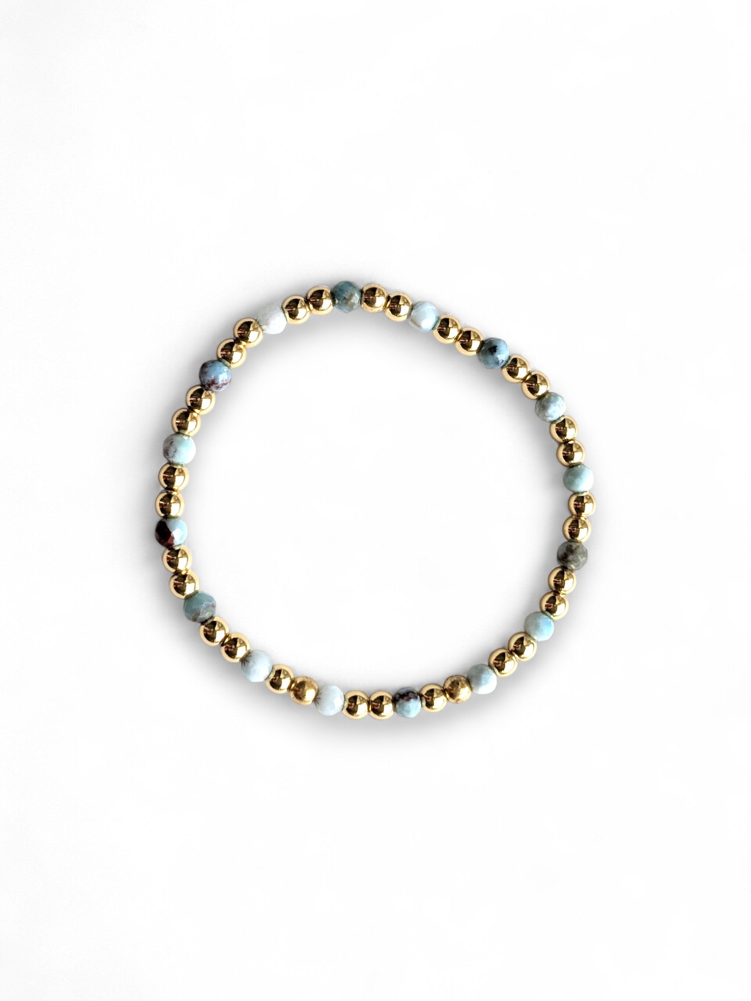 The most coastal of them all — the Blue-Grey Larimar Beaded Stretch Bracelet is calming and reminiscent of warm tropical waters. Featuring genuine 4mm larimar beads in serene blue-grey hues, this ethically sourced bracelet is hand-strung in Texas for everyday ocean-inspired elegance.