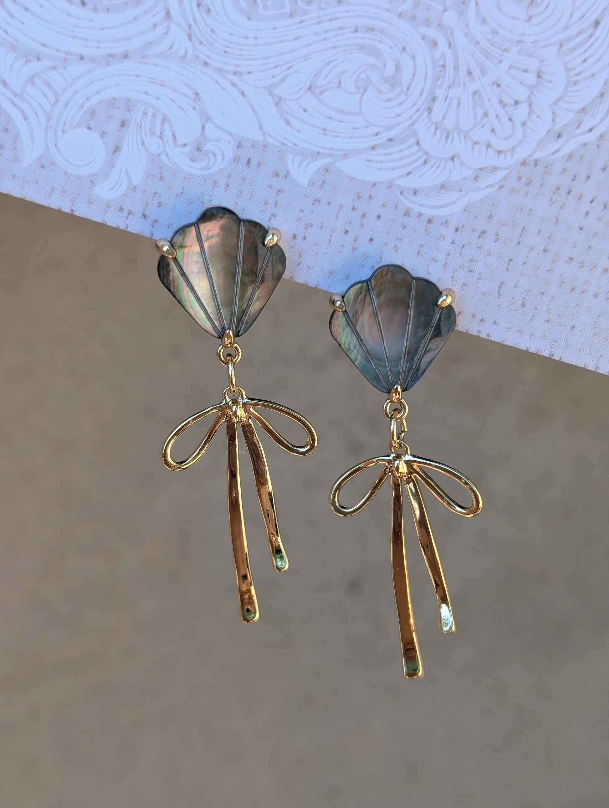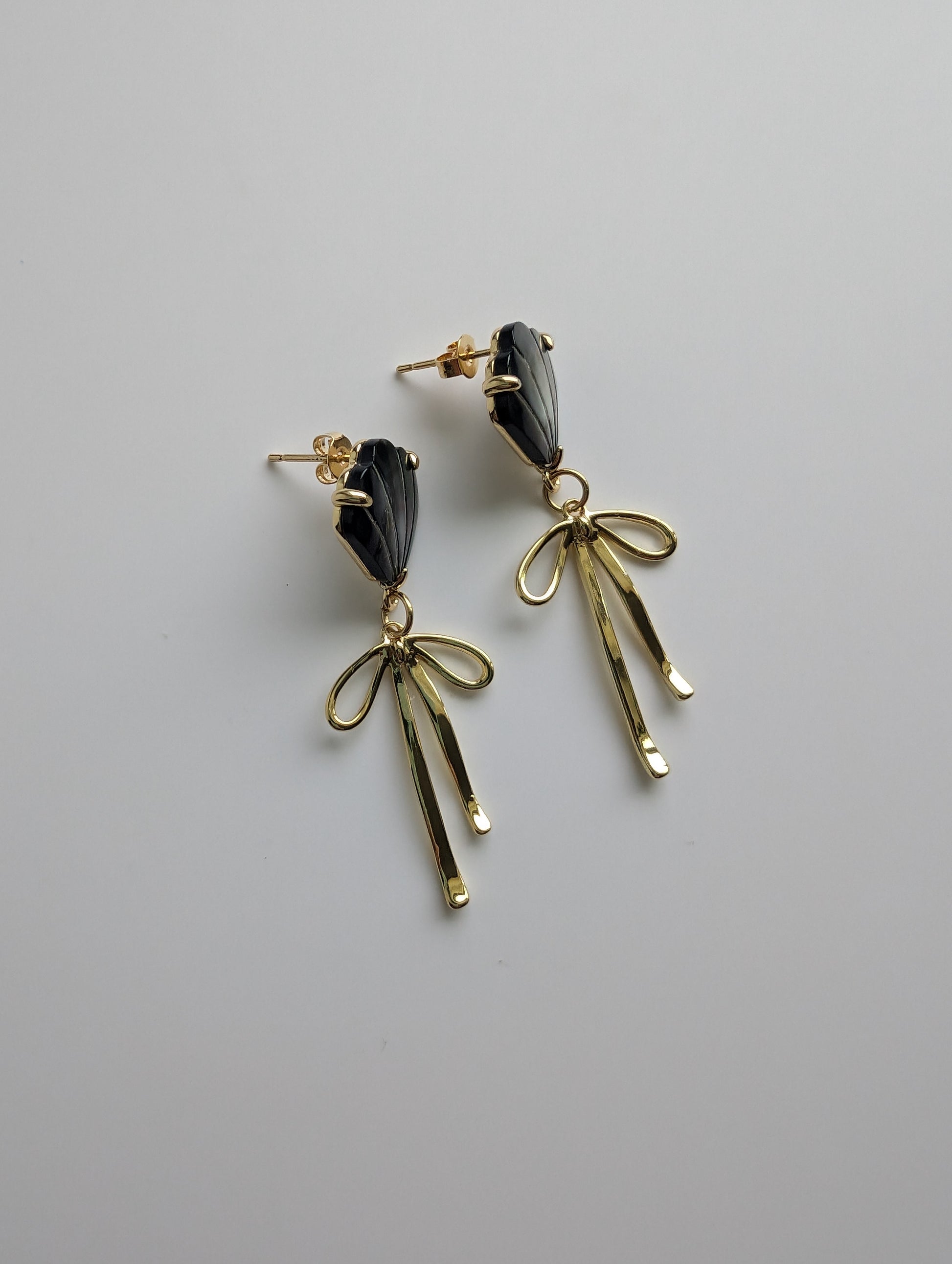 • 18k Gold plated Earrings with grey mother of pearl shell stud earring base with dangling bow charm.