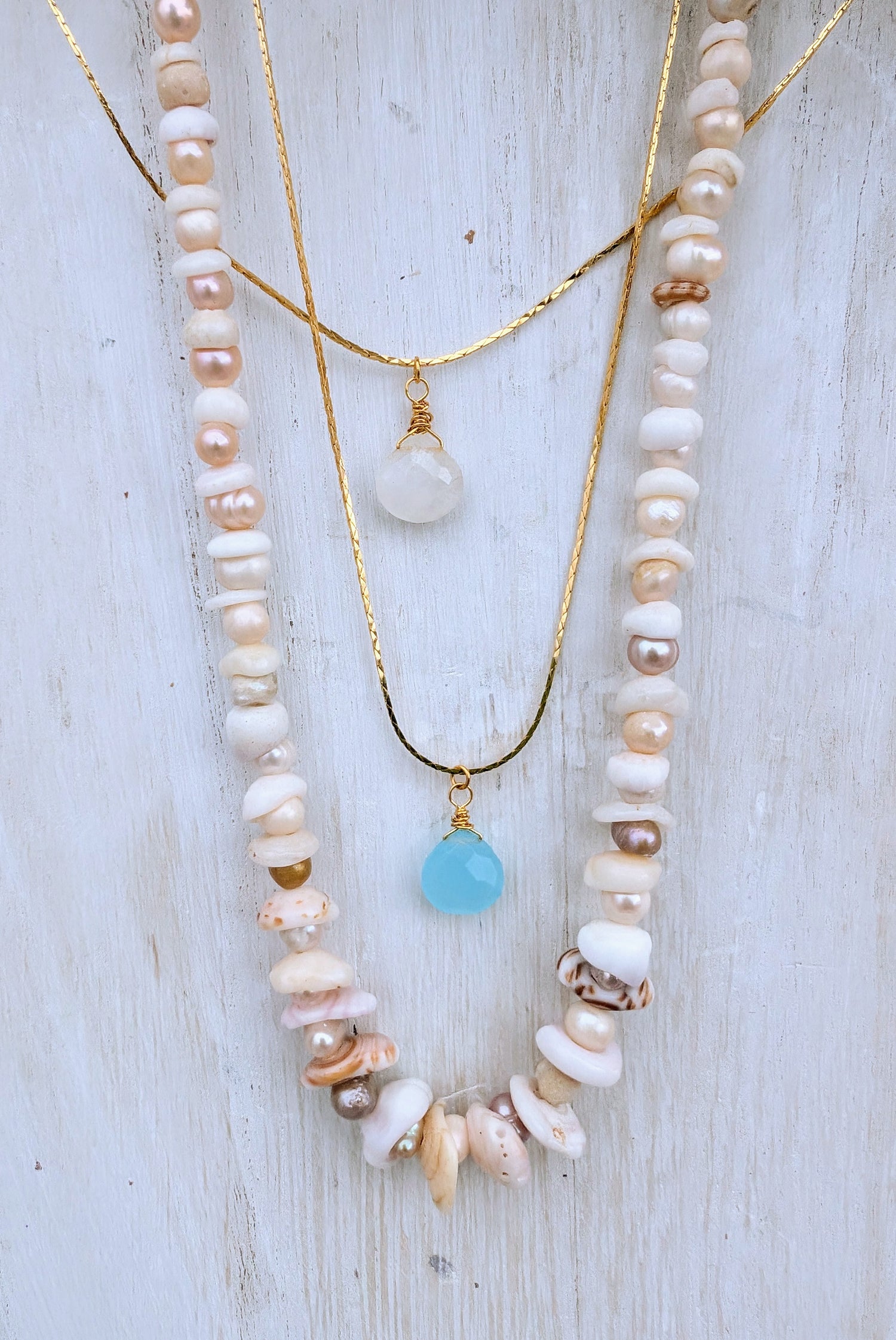 Dive into the serene depths of coastal allure with our enchanting tropical bohemian necklaces. Crafted with an artisanal touch, each piece embodies the essence of oceanic wonder. Natural shells, delicately sourced, infuse a sense of rustic charm, while lustrous pearls add a touch of elegance reminiscent of treasures from the sea. Inspired by the rhythmic ebb and flow of waves, these necklaces evoke a sense of wanderlust and a connection to the natural world. Wear them as a reminder of carefree beach days and let their ethereal beauty transport you to sandy shores and sun-kissed adventures.