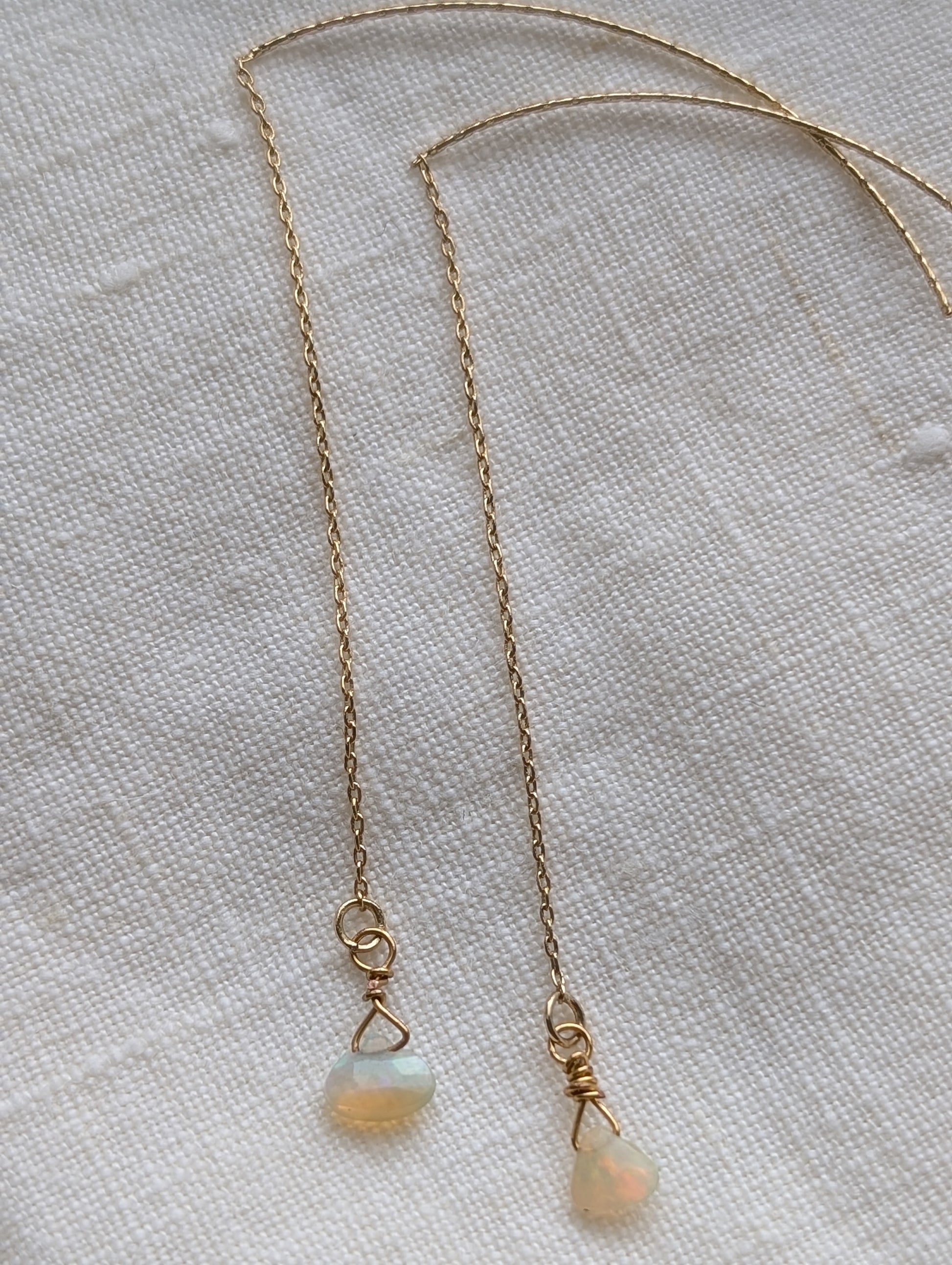 Elevate your style with the earrings—the perfect blend of elegance and versatility! Featuring Ethiopian opal 3mm heart briolettes on dainty drop chains and hypoallergenic findings, this pair can be worn solo for a touch of shimmer or layered with studs and huggies for a bold statement.