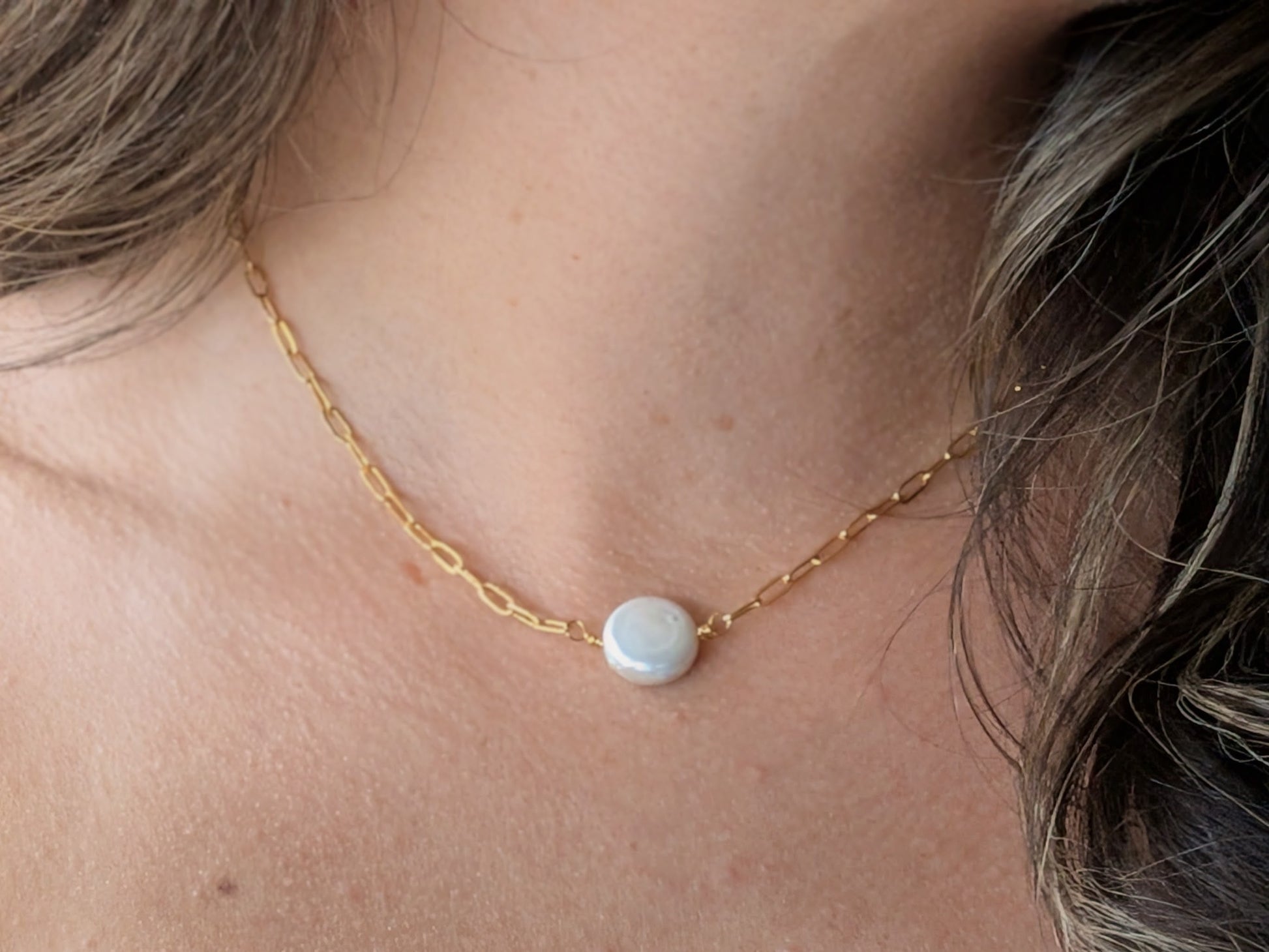 The Glenda Pearl Necklace features a luminous coin pearl that captures the light beautifully, suspended from a sleek gold-plated paperclip chain. Each necklace is hand-strung with care in Leander, Texas, and finished with a 2-inch extender for your perfect fit.