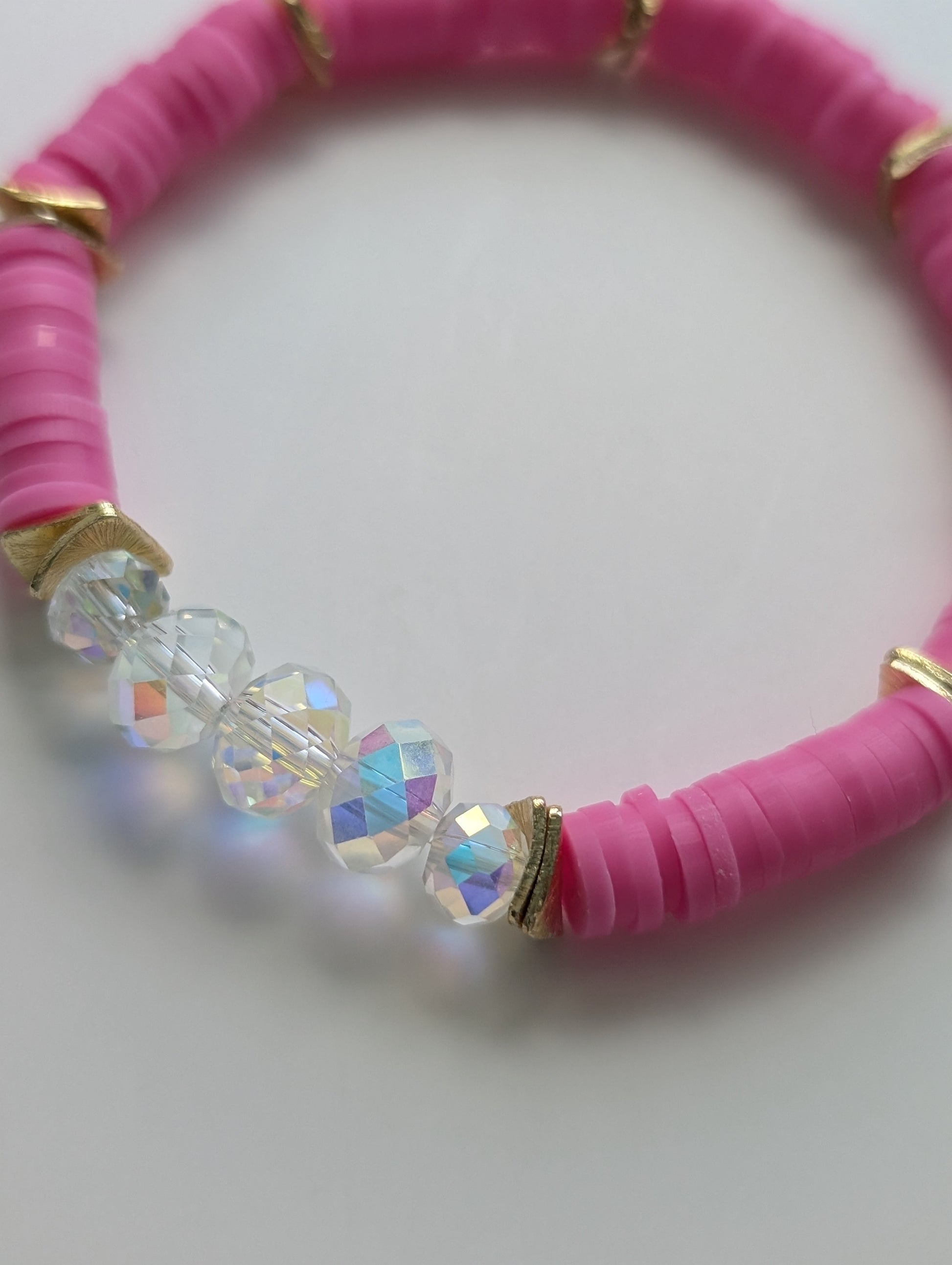 Dazzle your wardrobe with the White Pearl Resort-Ready Heishi Bracelet. Featuring Classic vinyl heishi beads, shimmering pearlescent rhinestones, and luxe 18k gold accents, this bracelet captures the playful spirit of the elegant pearls
