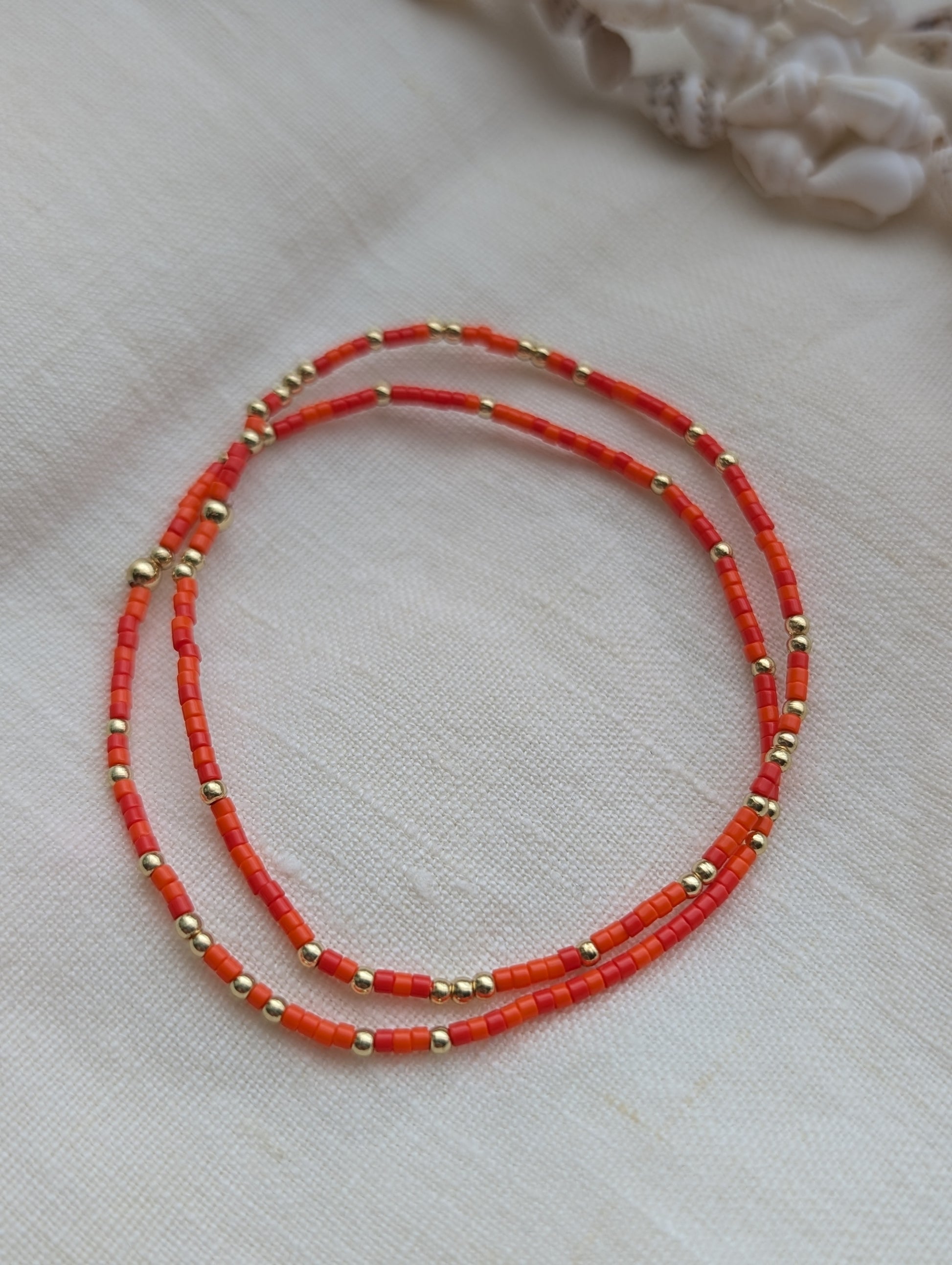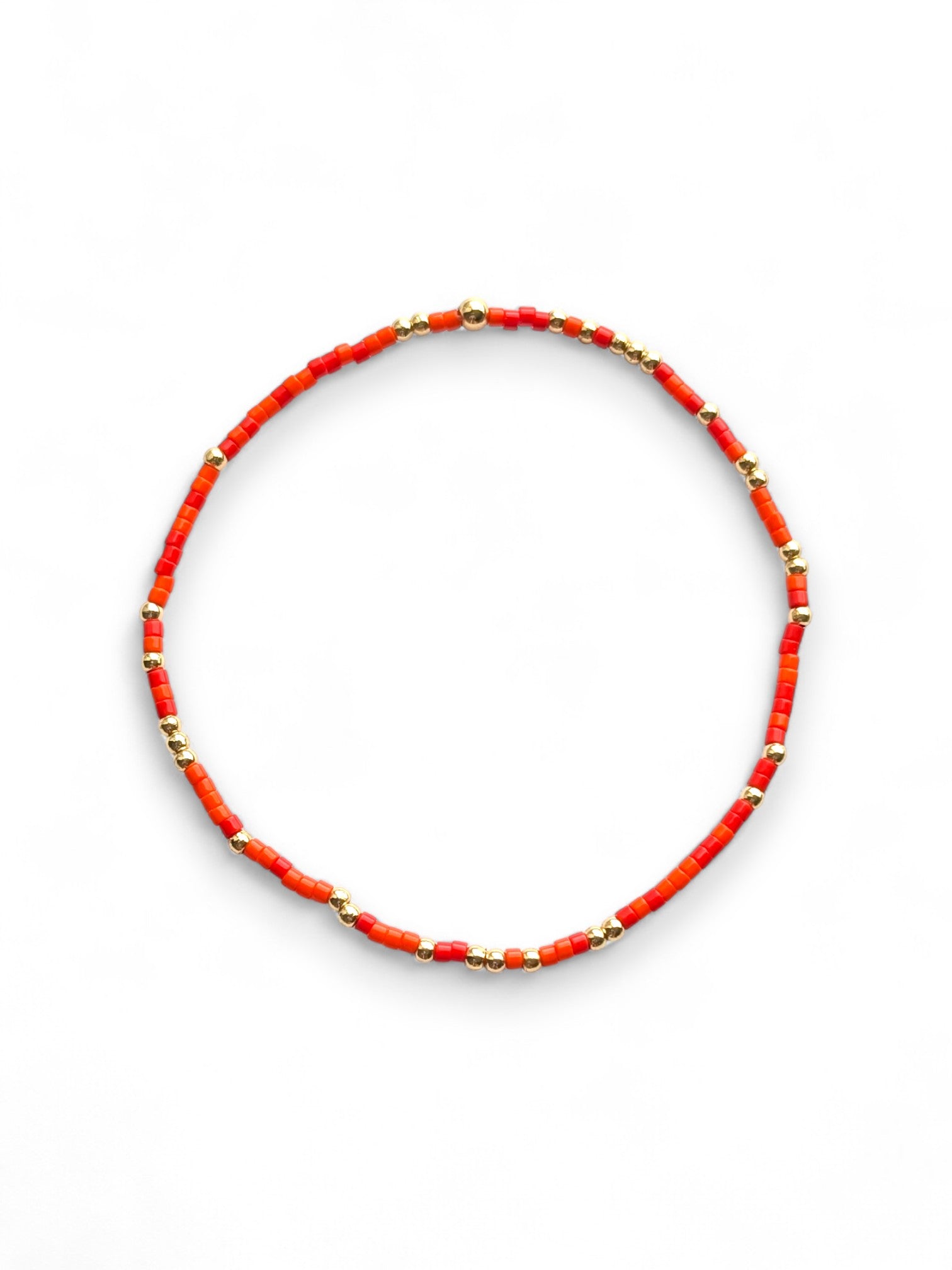 Elevate your style with the bracelet—the perfect blend of elegance and versatility! Featuring 2mm 18k gold-filled beads, red & orange glass seed beads, a lightweight stretch fit, and hypoallergenic comfort, this piece can be worn solo for a touch of shimmer or layered for a bold statement.