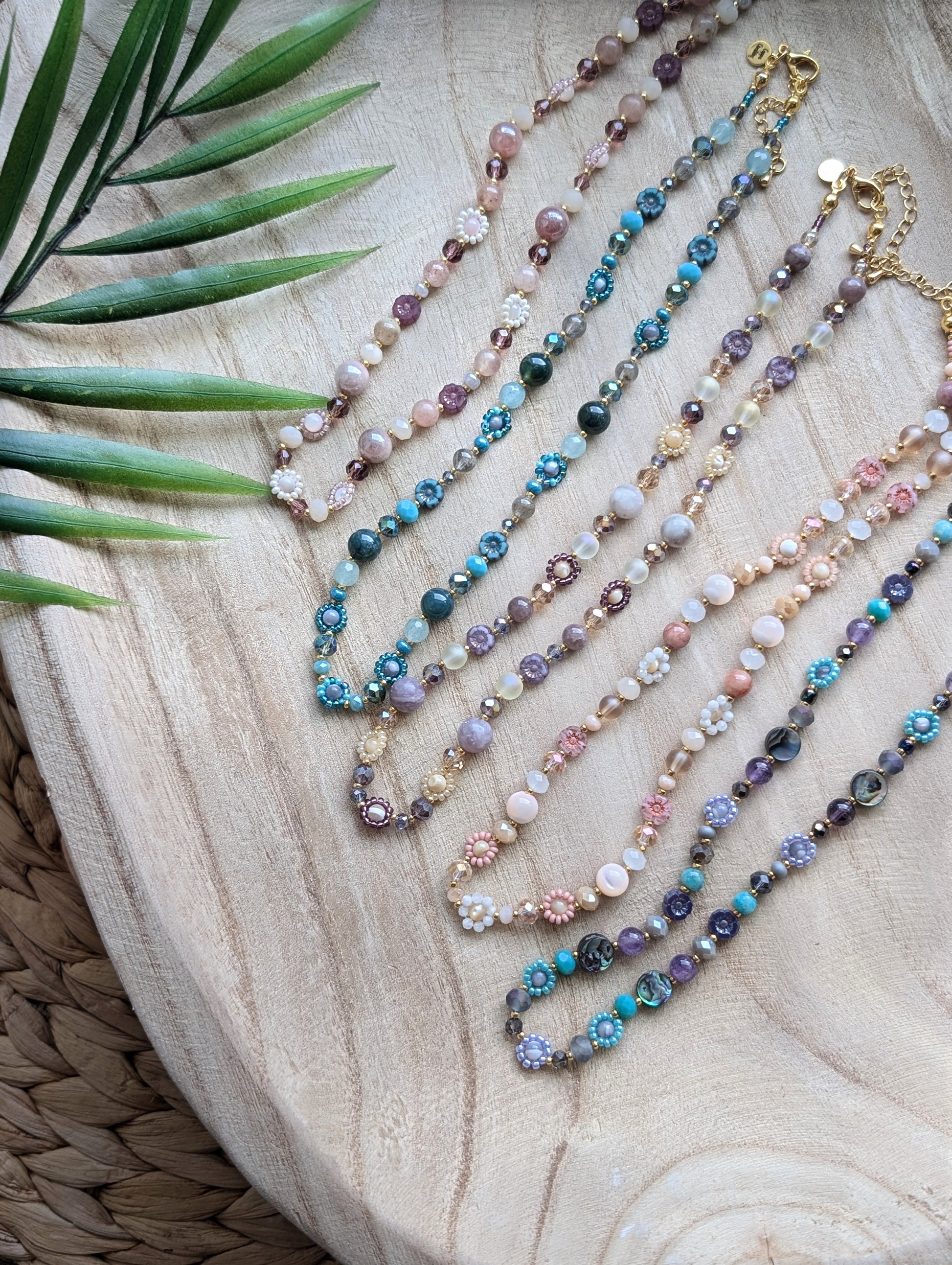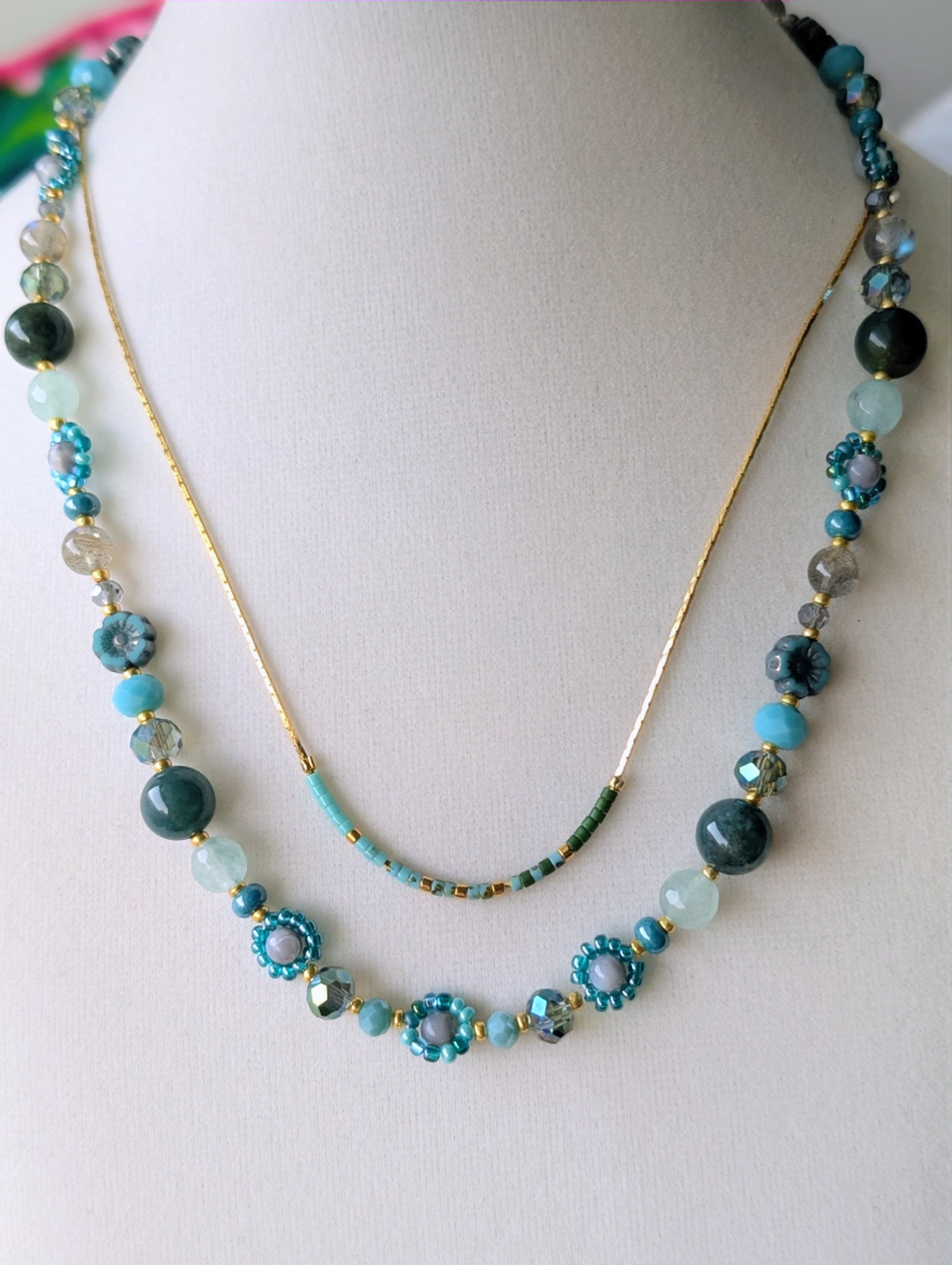 - Color: Sea La Vie – moss green jade, turquoise, aventurine, labradorite, iridescent greens + mother of pearls