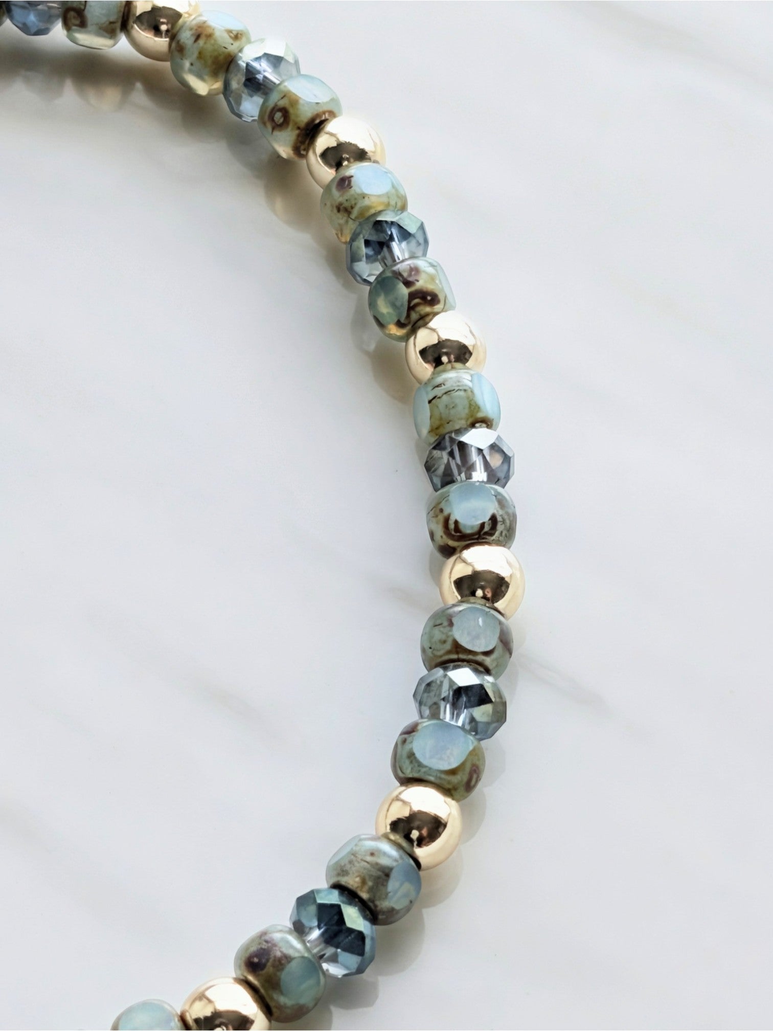 The Vivienne Bracelet embodies understated luxury and natural beauty. Designed with faceted opaque sage Charlotte-cut beads, each one reveals soft marbling for an earthy, organic look. Between each bead, faceted crystal accents shimmer subtly, shifting in color as they catch the light, while 18k gold-filled details add warmth and refinement.